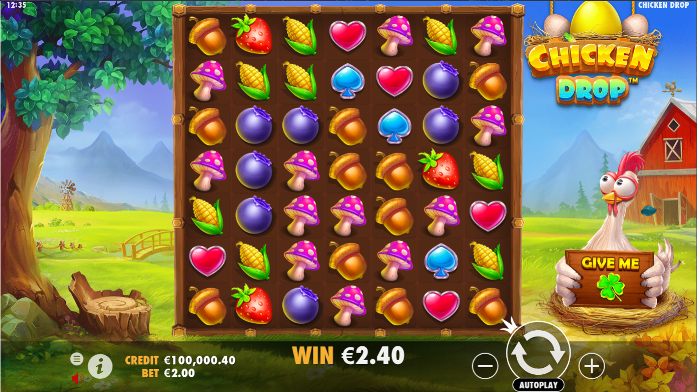Pragmatic Play, un adevărat profesionist în dezvoltarea de sloturi Cluster Pays, a decis încă o dată să își arate abilitățile prin introducerea lui Chicken Drop, un slot video teribil cu o grafică uimitoare, un sunet plăcut, multe simboluri creative și un potențial mare de câștig. Deși a fost introdus relativ recent (29 iulie 2021), jucătorii SlotV pot deja să se bucure de acțiune pe un teren de joc de 7x7, cu rolele amplasate pe o pajiște verde și o fermă. După cum probabil ați ghicit, Chicken Drop se referă la ouăle capabile să aducă câștiguri mari. În plus, cu multiplicatori suplimentari și simboluri gigantice, acest titlu este capabil de câștiguri destul de mari, de până la x5.000 din miza totală.